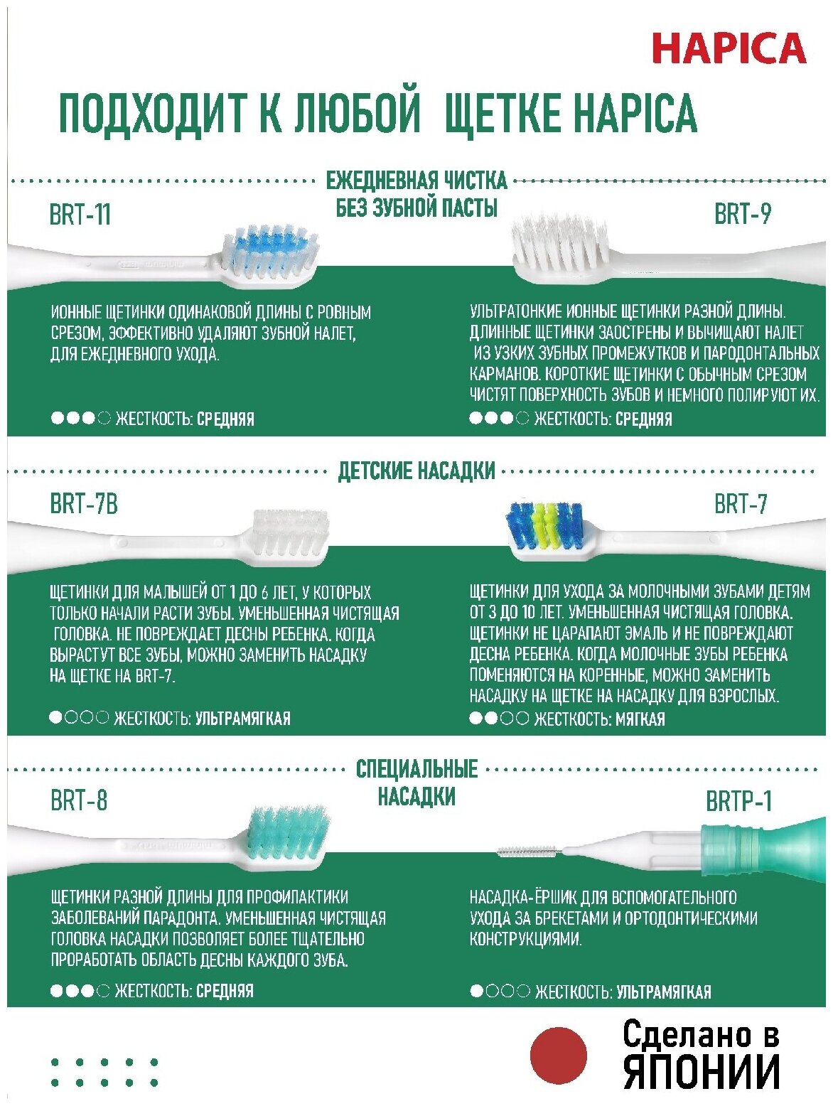 Cменные насадки для электрической зубной щетки Hapica BRT-7Gp для детей 3 -10 лет, 2 шт. Мягкие щетинки. Зеленая ножка. Подходят всем щеткам Hapica