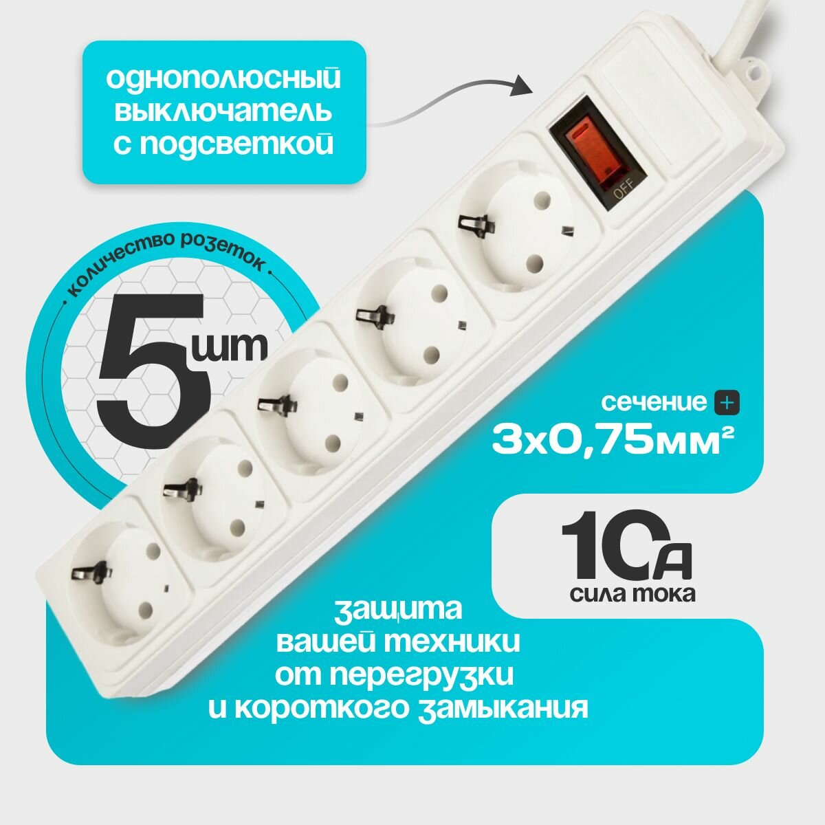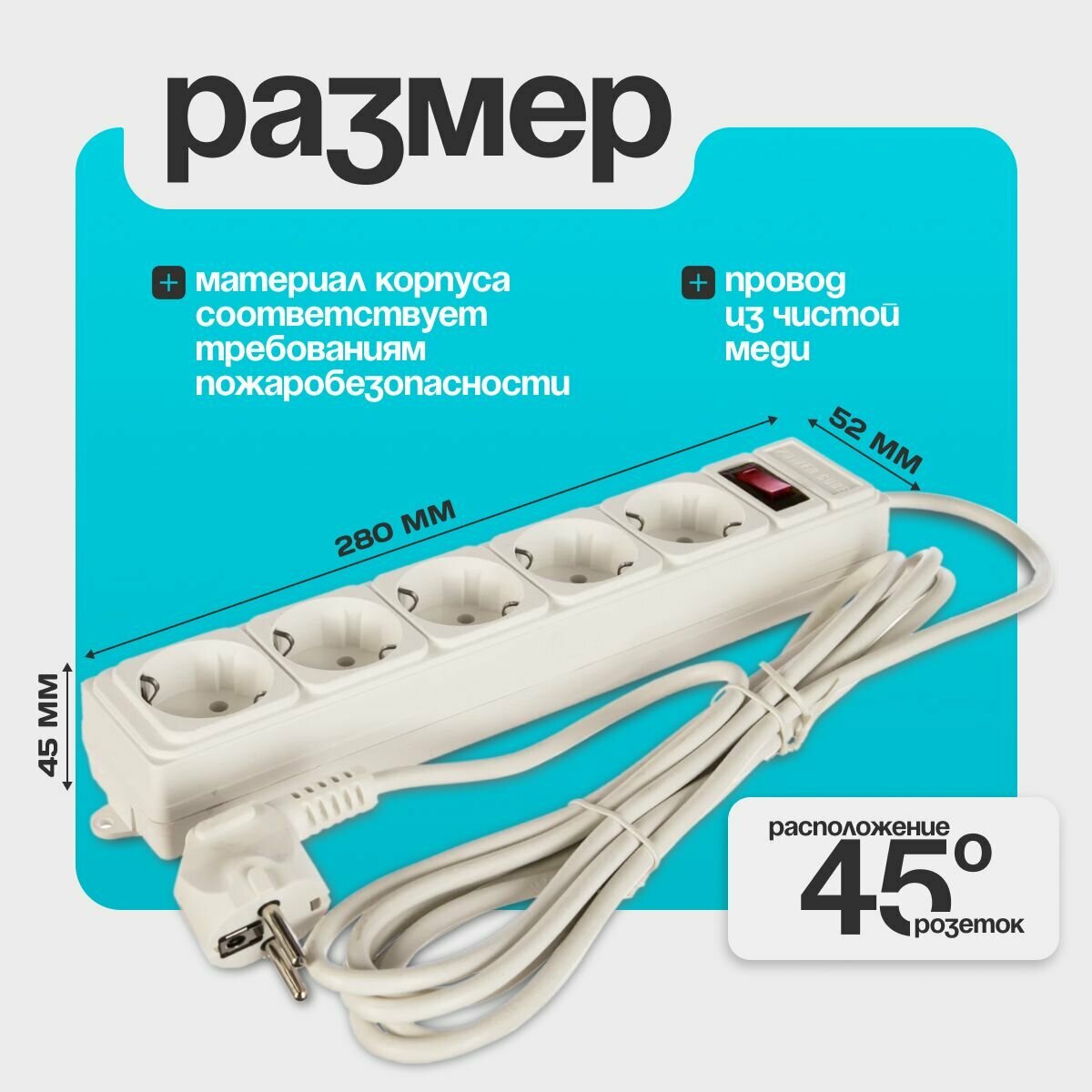 Сетевой фильтр-удлинитель Power Cube 3 метра, 5 розеток, белый, 10А/2,2кВт PG-B-3M информация: