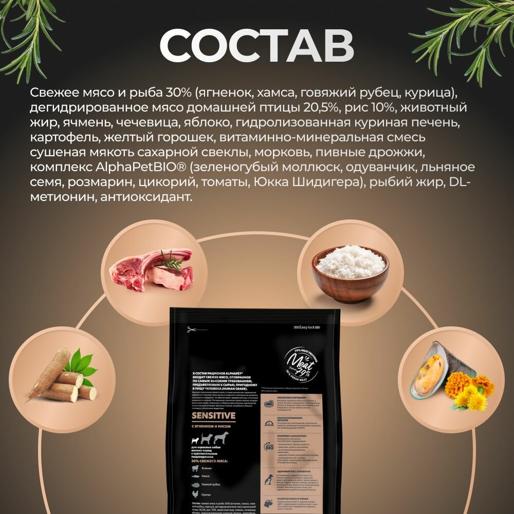 Корм для собак сухой АльфаПет Superpremium Sensitive для взрослых животных мелких пород с чувствительным пищеварением, гранулы с ягненком и рисом