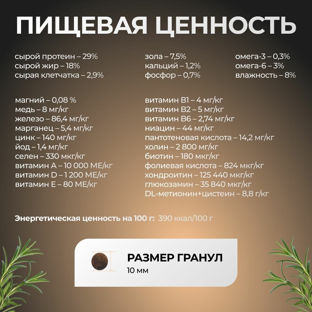 | Витамины | А, D, Е, В1, В2, B6, ниацин, пантотеновая кислота, холин, биотин, фолиевая кислота, хондроитин, глюкозамин, DL-метионин + цистеин |
