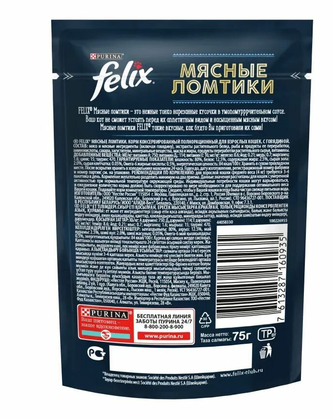 Корм влажный для кошек Felix Мясные ломтики в соусе, 75 гр./ Для любой породы, 26 штук информация: