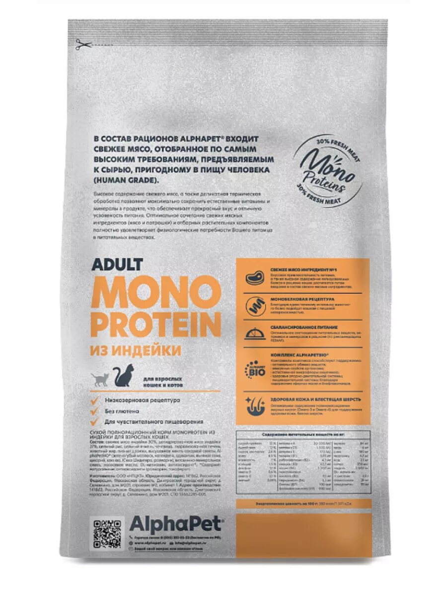 Сухой полнорационный корм MONOPROTEIN из индейки для взрослых кошек AlphaPet Superpremium, 3 кг 2 631 ₽