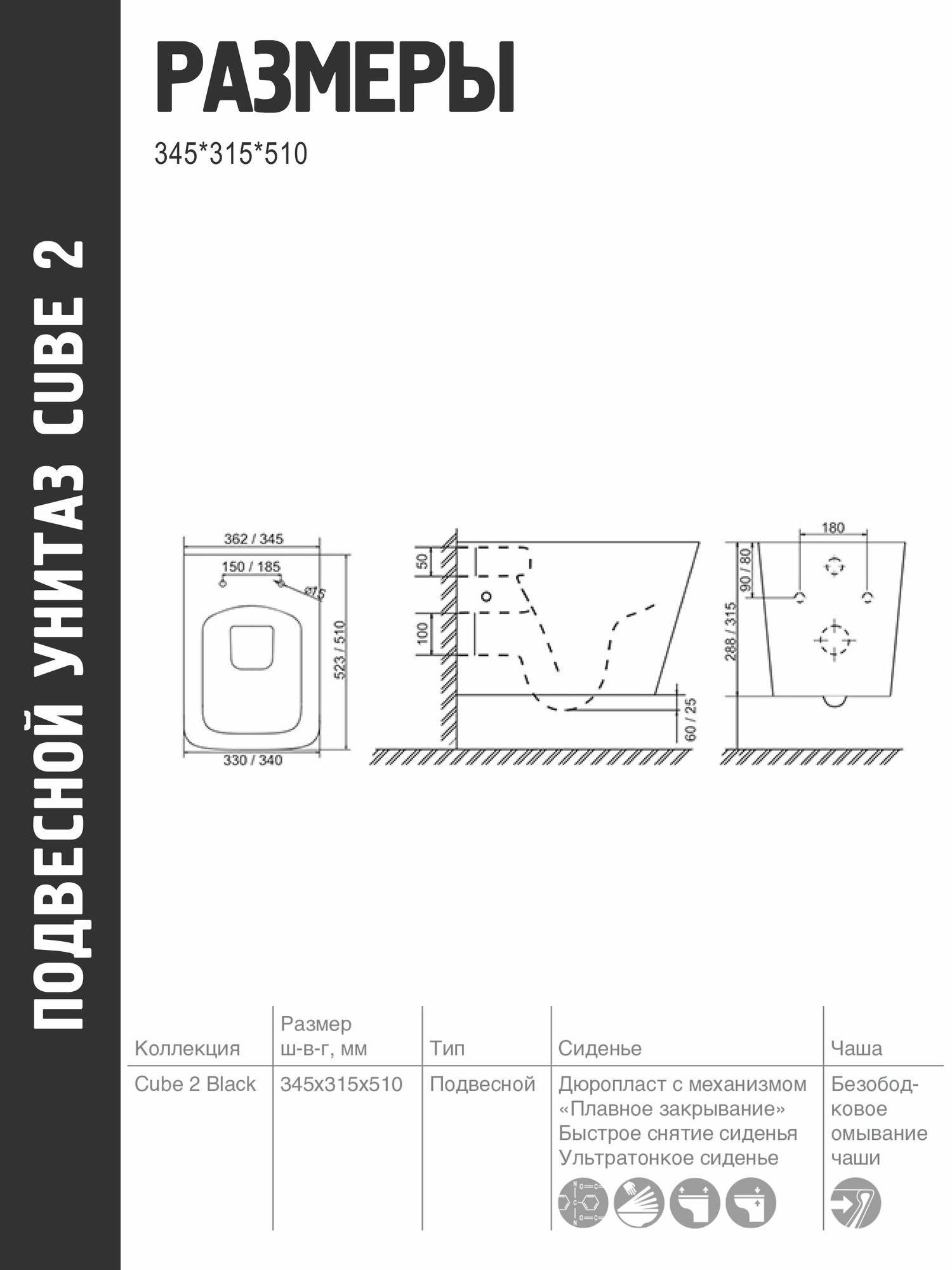 Подвесной унитаз CUBE 2 BLACK, безободковый, черный с черной матовой крышкой Soft-close 37 903 ₽