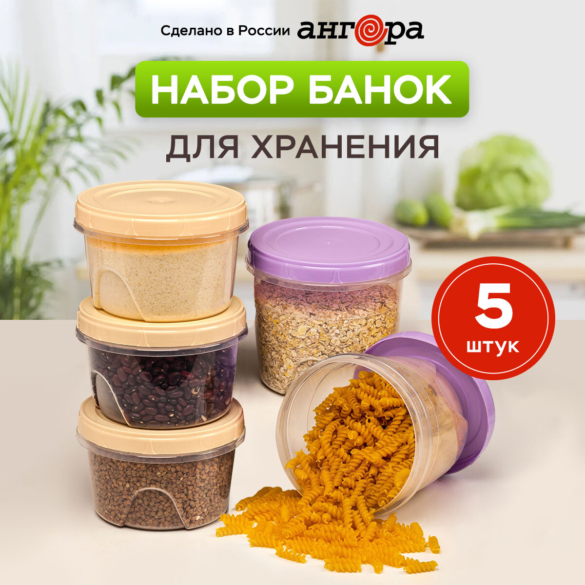 10 цен на Набор контейнеров "Ангора" для еды и сыпучих продуктов, 5 штук, 700мл + 1000мл, круглые, кремовый и сиреневый