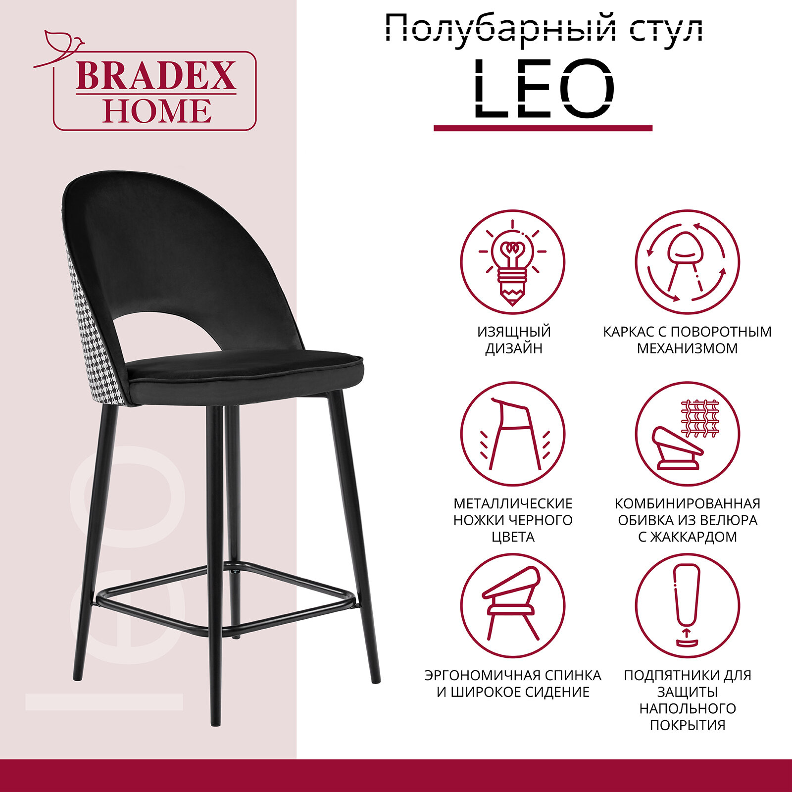 Отзывы на Стул полубарный с поворотным механизмом Leo черный велюр с жаккардом / Стулья мягкие со спинкой для дома, дачи/ Стулья барные для кухни, на балкон