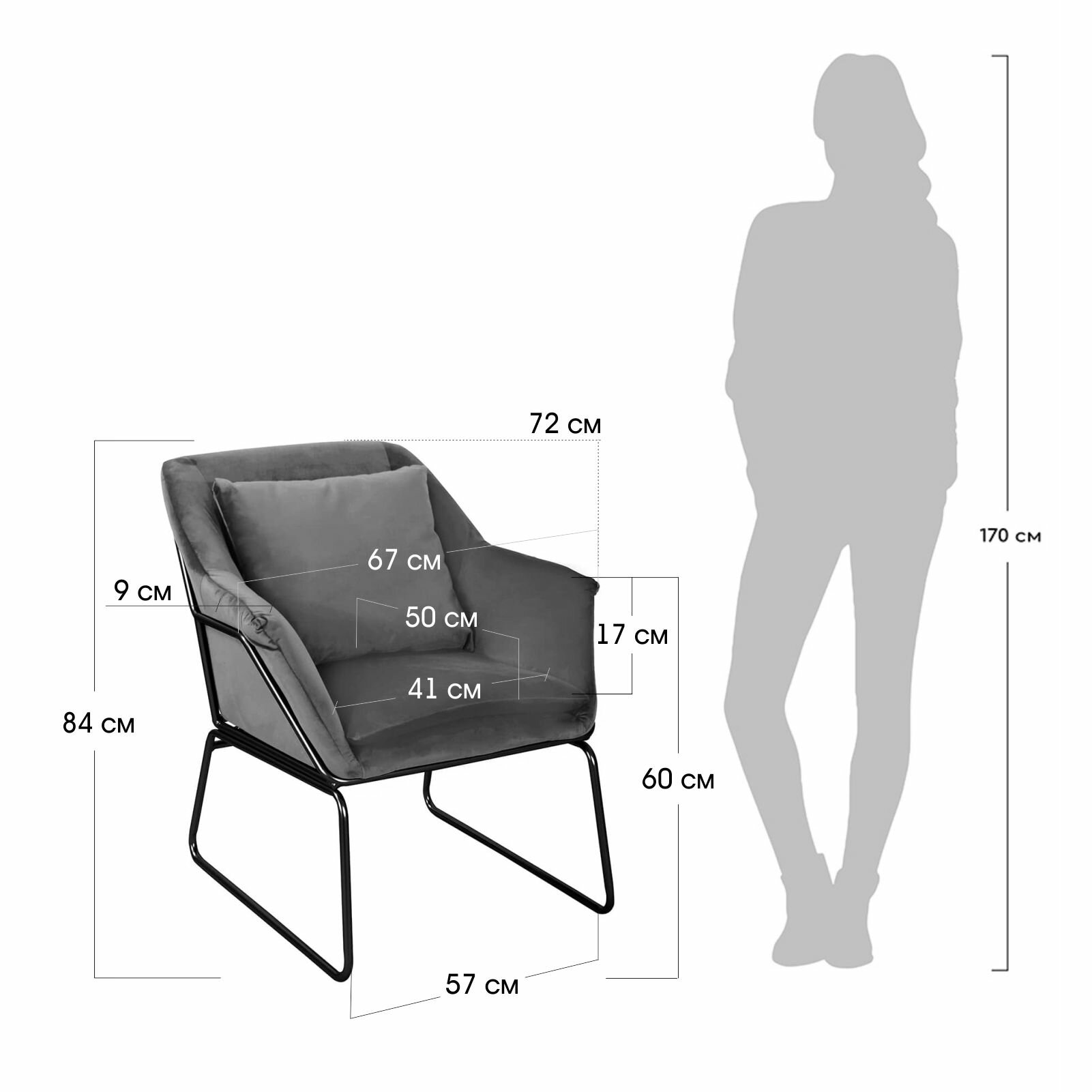 Кресло с подушкой мягкое велюр ALEX серое, для отдыха, на черных металлических ножках, офисное, интерьерное для дома в гостиную и на кухню