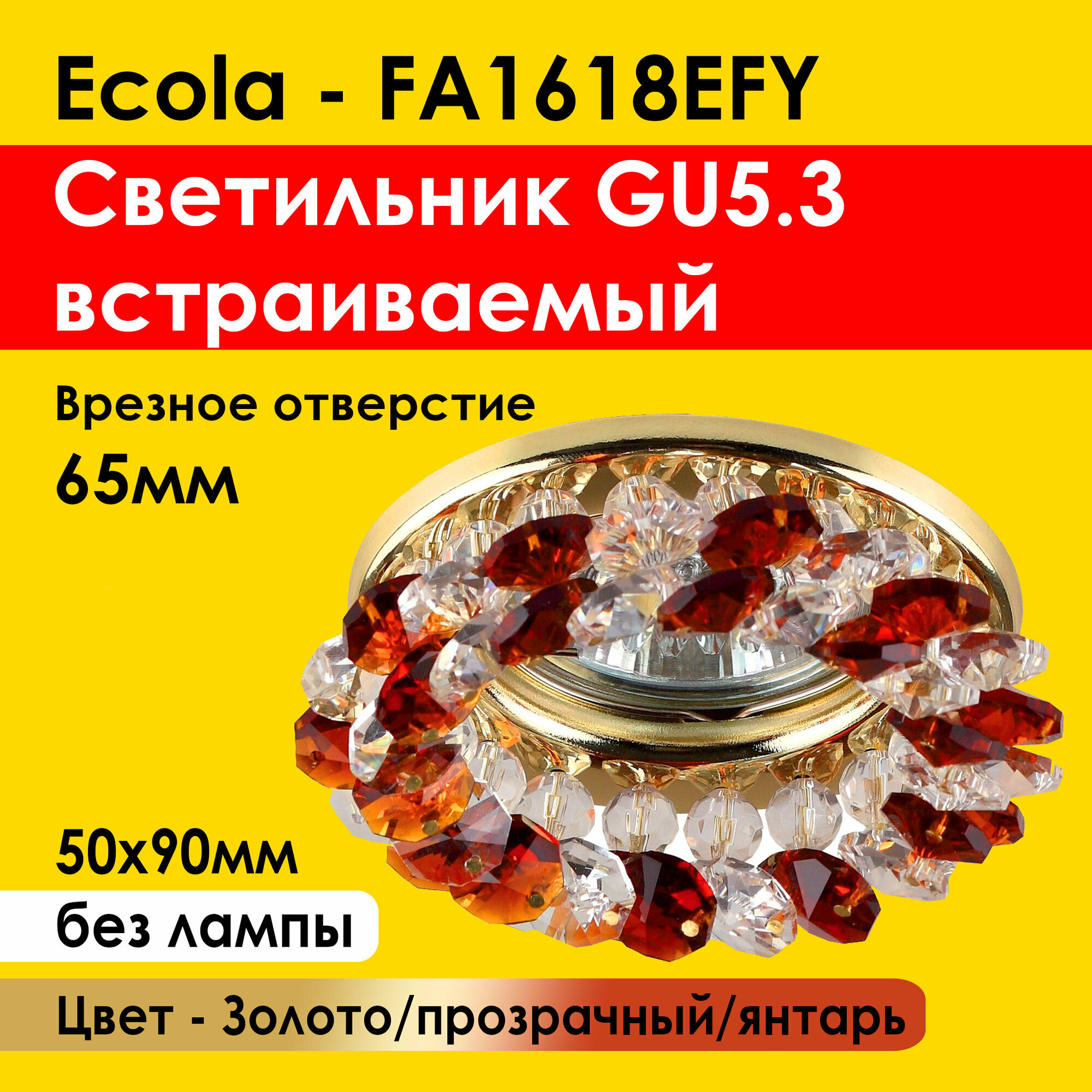 Отзывы на Ecola Светильник встраиваемый GU5.3 Золотой MR16 CD4141 хрусталики 2 цв. прозрачный/янтарь 90х50 (FA1618EFY) потолочный, 65мм врезка