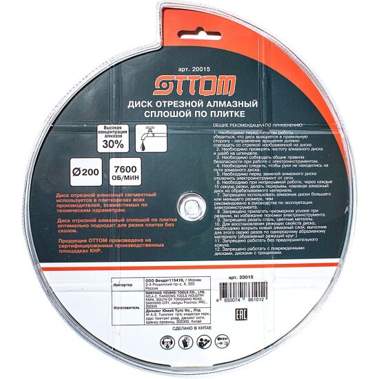 Диск алмазный отрезной OTTOM сплошной по плитке 200x25.4mm информация: