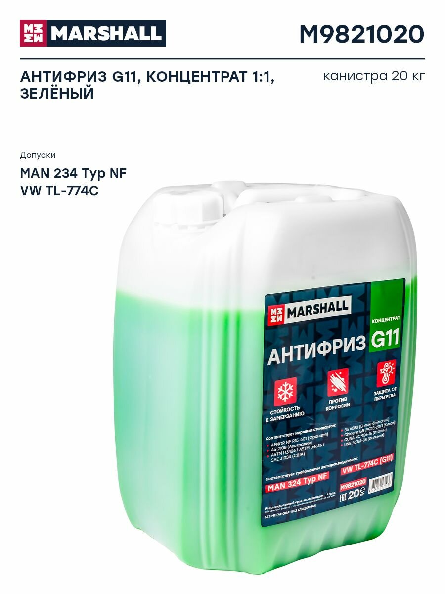 MARSHALL M9821020 Антифриз G11, концентрат 11, зеленый, канистра 20 кг. 12 184 ₽