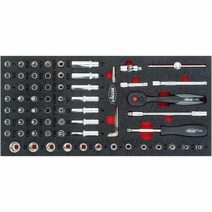 | Дополнительная информация | 1/4: трещотка 150 мм, удлинитель гибкий 150 мм, удлинители 50, 100, 250 мм, отвертка с присоединительным квадратом 150 мм; 1/2": удлинители 75, 125, 250 мм, вороток шарнирный 375 мм адаптер для удлинителя 1/2″M х 3/8″F , ручка магнитная телескопическая 133-640 мм |