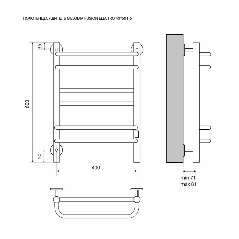 Полотенцесушитель электрический Fusion Electro 400мм600мм лесенка П6 2*2*2 cухой ТЭН 99Вт встр.диммер Melodia della vita информация: