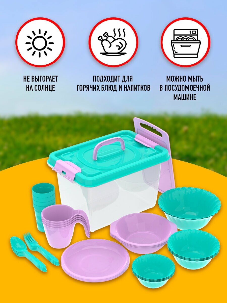 Набор походной пластиковой посуды в контейнере с ручкой для пикника, на шашлыки, для туризма, барбекю для 4 человек 17 предметов №24 АП 783 Пятница
