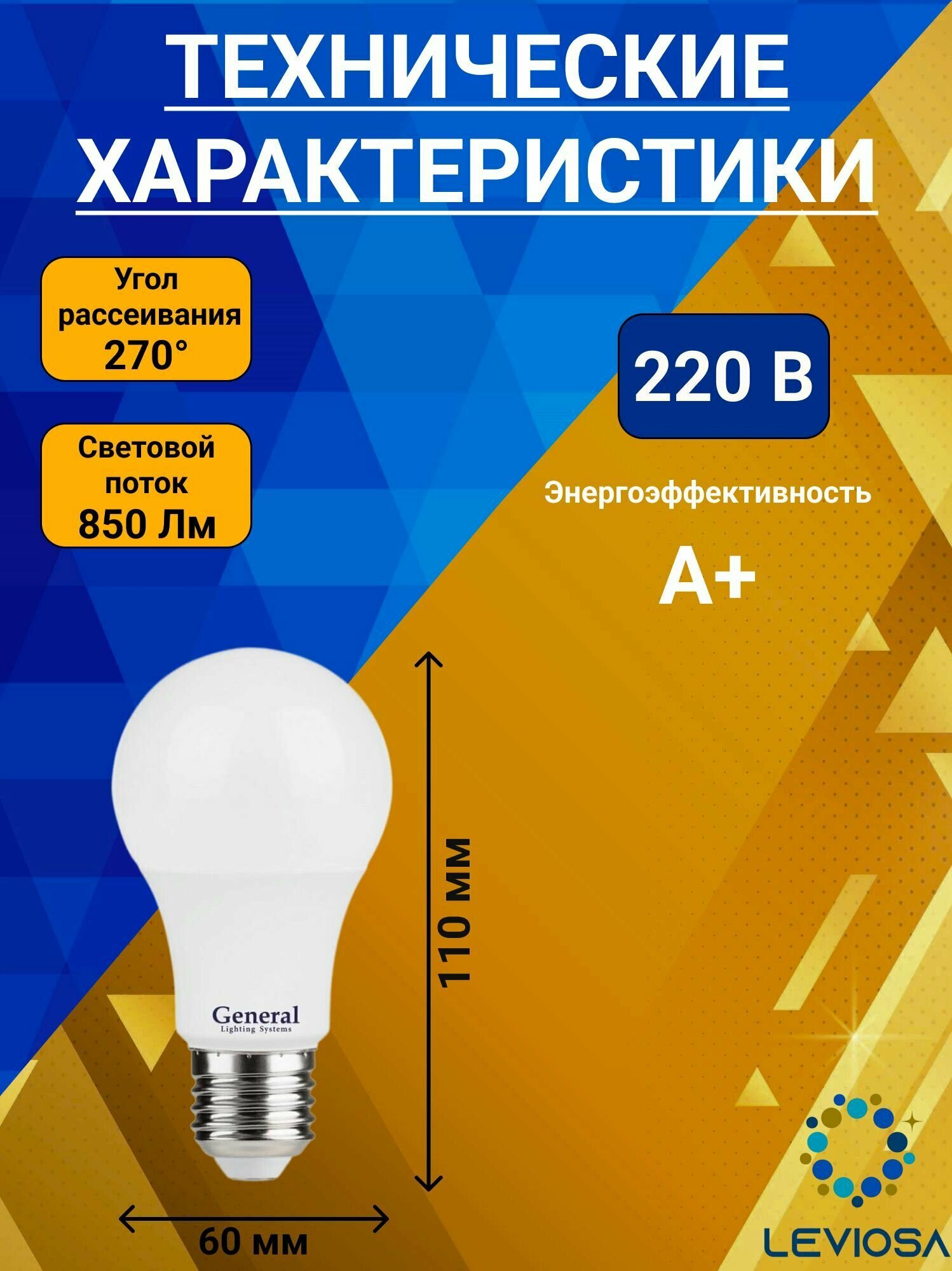 (20 шт.) Светодиодная лампочка General ЛОН A60 E27 11W 6500K 6K 60x110 пластик/алюмин. 636900 Холодный белый. Цоколь E27 3 419 ₽