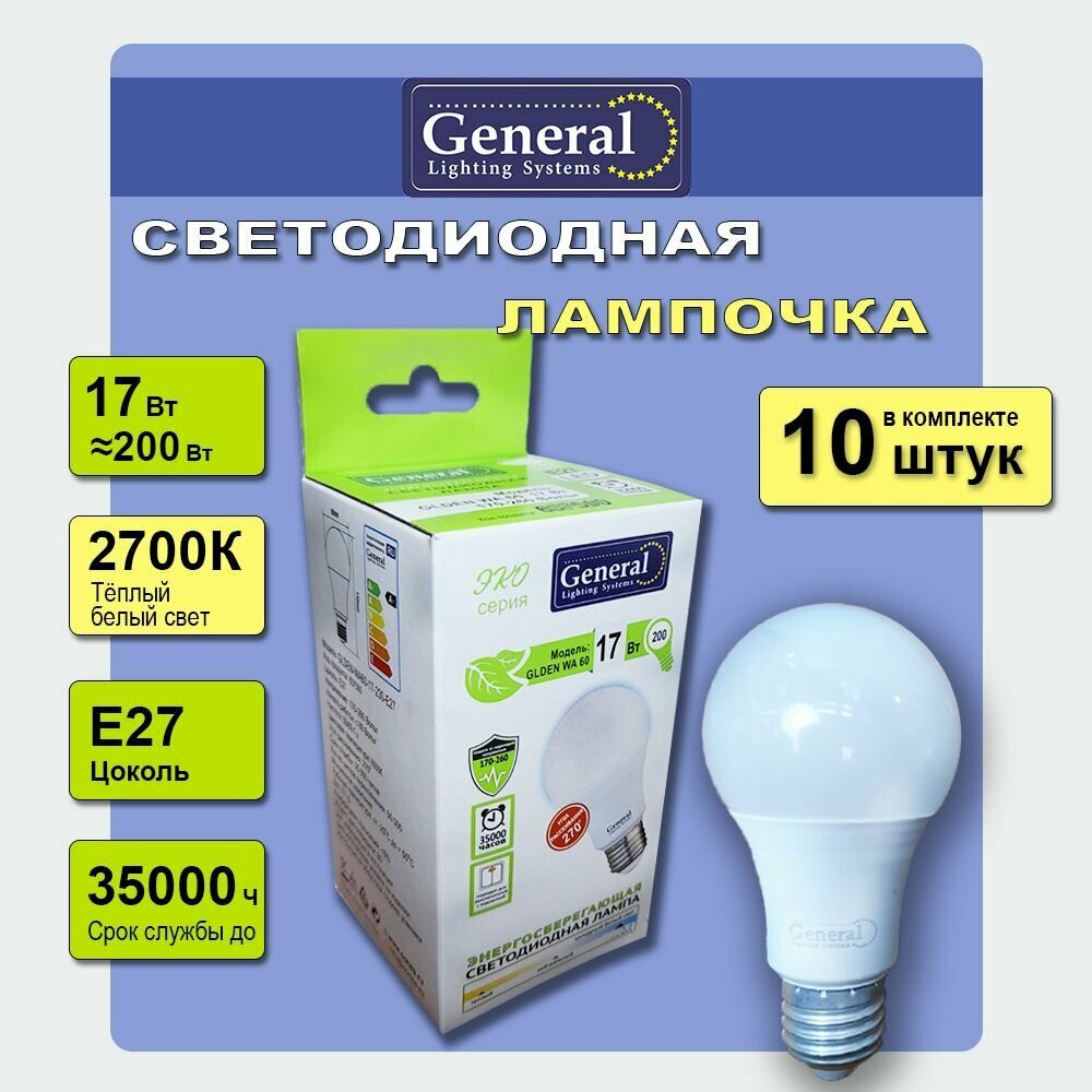 10 цен на Светодиодные лампы, General, Комплект из 10 шт., Мощность 17 Вт, Цоколь E27, Теплый свет