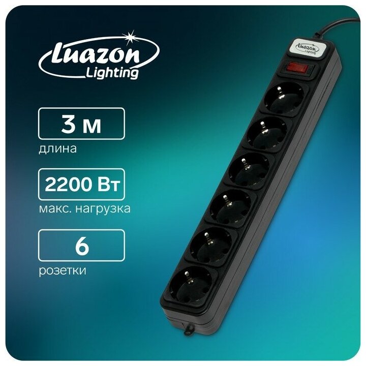 Сетевой фильтр Luazon Lighting, 6 розеток, 3 м, 2200 Вт, 3 х 0.75 мм2, 10 А, 220 В, черный./В упаковке шт: 1 информация: