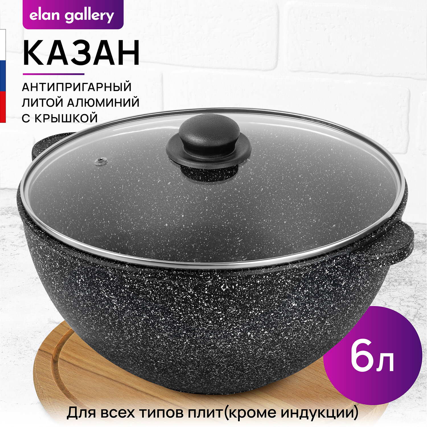 Казан 6 л Elan Gallery гармония вкуса "Черный мрамор" С крышкой ф28, 34,5*29,5*19,5 см информация: