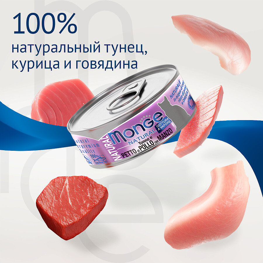 Влажный корм Monge Cat Natural для кошек, тунец с курицей и говядиной, ж/б, 80 г Monge .