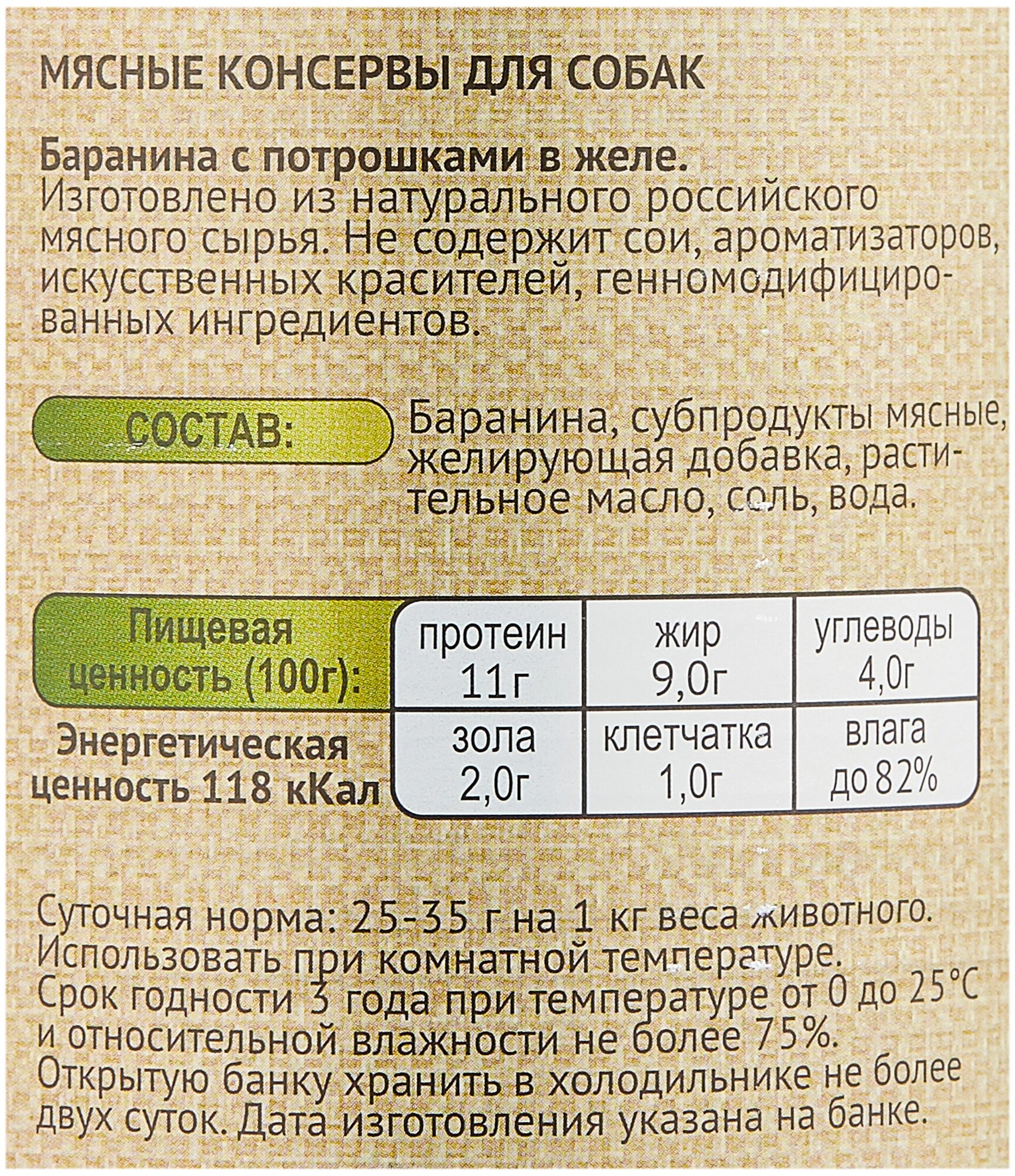| Состав | баранина, субпродукты мясные, желирующая добавка, растительное масло, соль, вода |