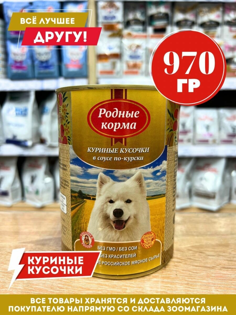 Корм влажный Родные для собак Куриные кусочки по-Курски консервы 970 гр информация:
