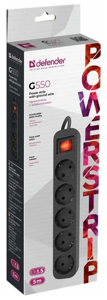 Отзывы на Удлинитель сетевой Defender G550, 5 розеток с заземлением , 5 метров , черный