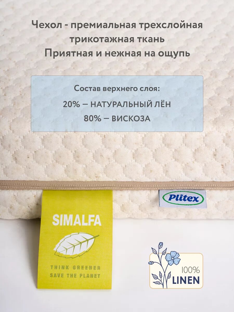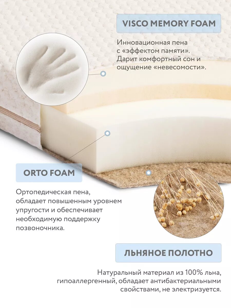 | Дополнительная информация | лен 100%; Memory Foam; ортопедическая пена Ortofoam; анатомический; антибактериальный |