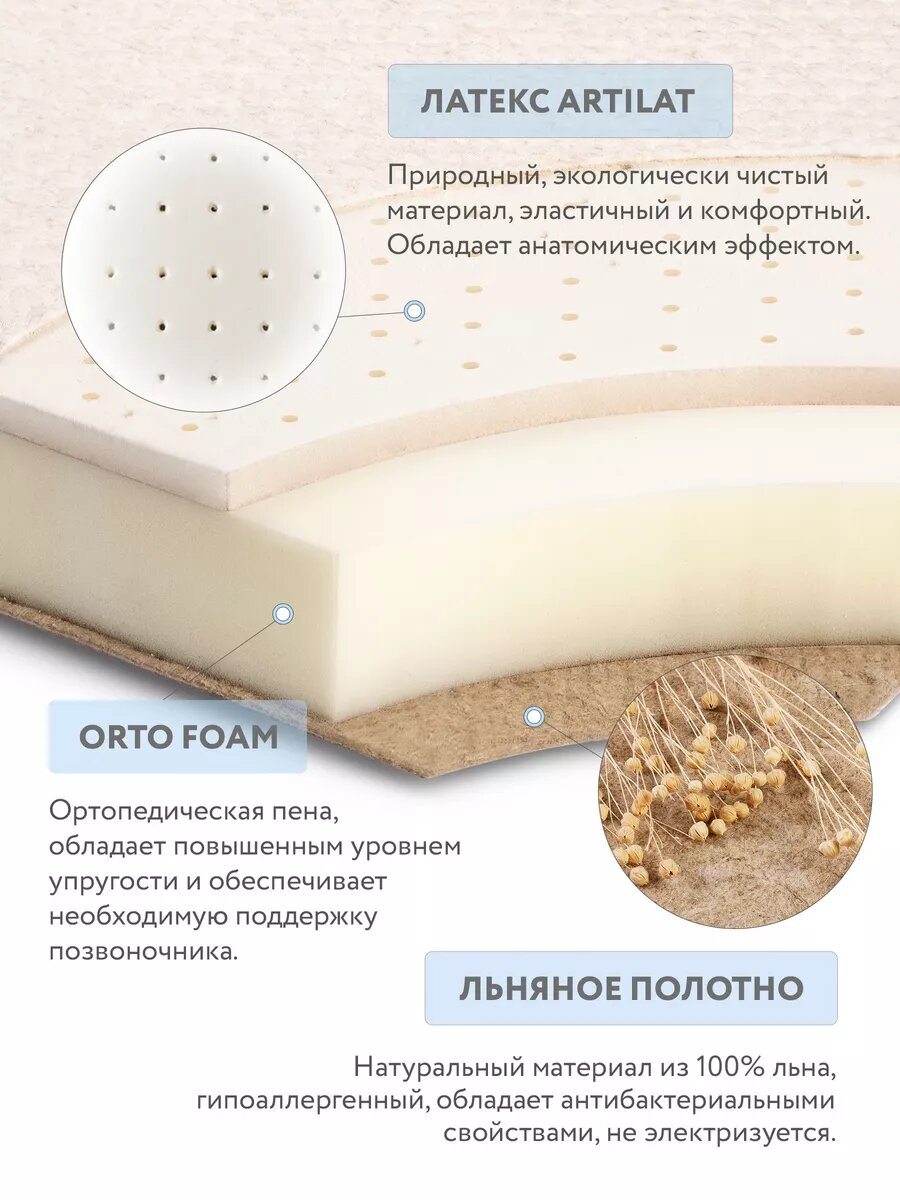 | Дополнительная информация | лен 100%; Memory Foam; ортопедическая пена Ortofoam; анатомический; антибактериальный |