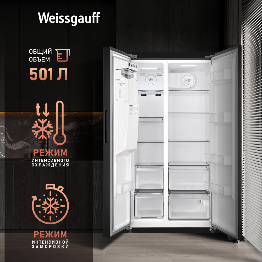 Отдельностоящий холодильник с инвертором и генератором льда Weissgauff Wsbs 697 Nfbx Inverter Ice Maker Side by Side двухдверный, 3 года гарантии, Мощность замораживания 10 кг сутки, Объём 547 л, Подача питьевой воды, Суперзаморозка, Суперохлаждение, A+ информация: