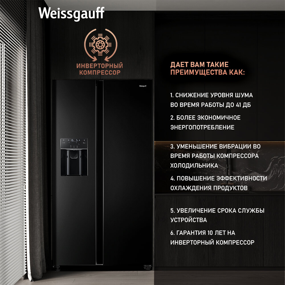 10 цен на Отдельностоящий холодильник с инвертором и генератором льда Weissgauff Wsbs 697 Nfbx Inverter Ice Maker Side by Side двухдверный, 3 года гарантии, Мощность замораживания 10 кг сутки, Объём 547 л, Подача питьевой воды, Суперзаморозка, Суперохлаждение, A+
