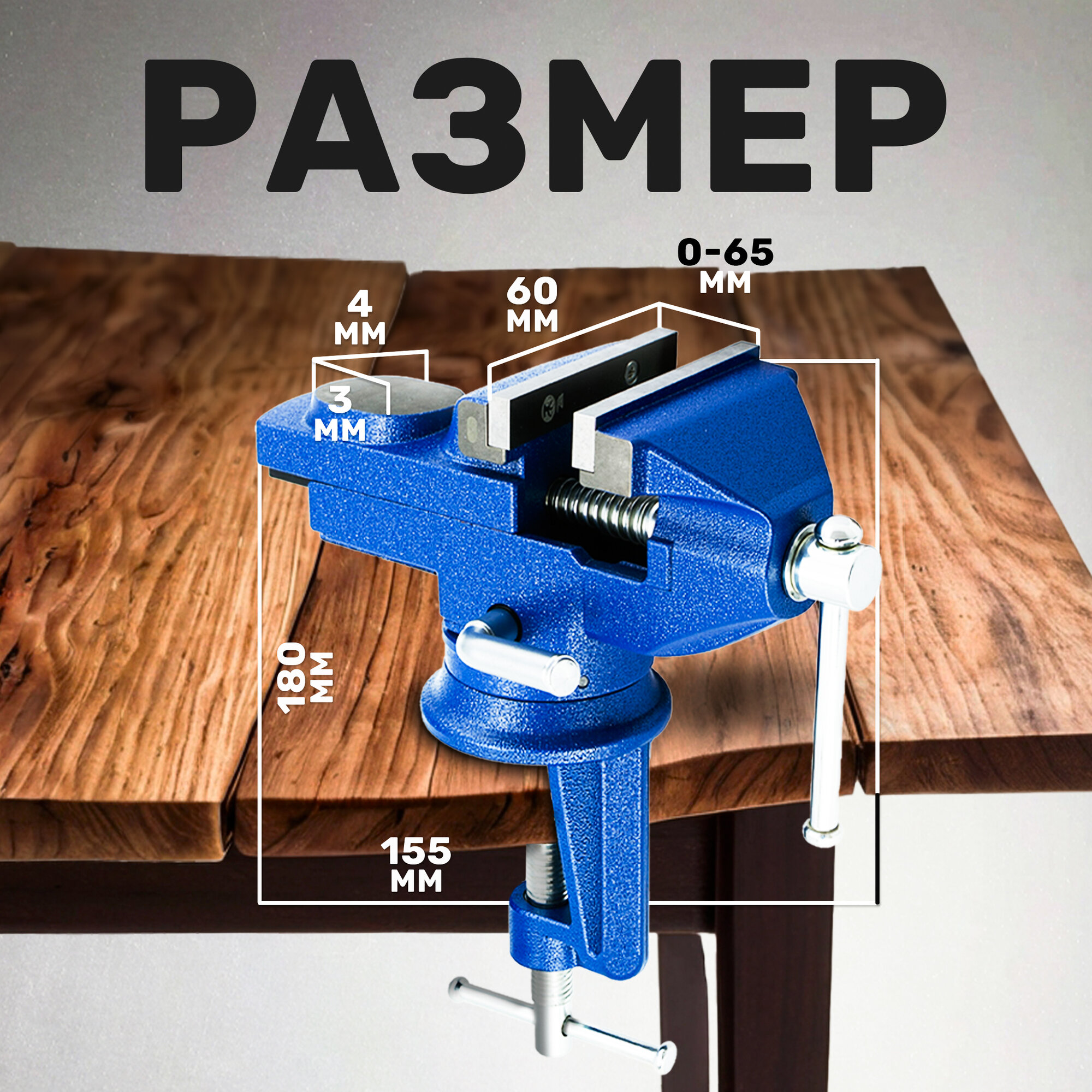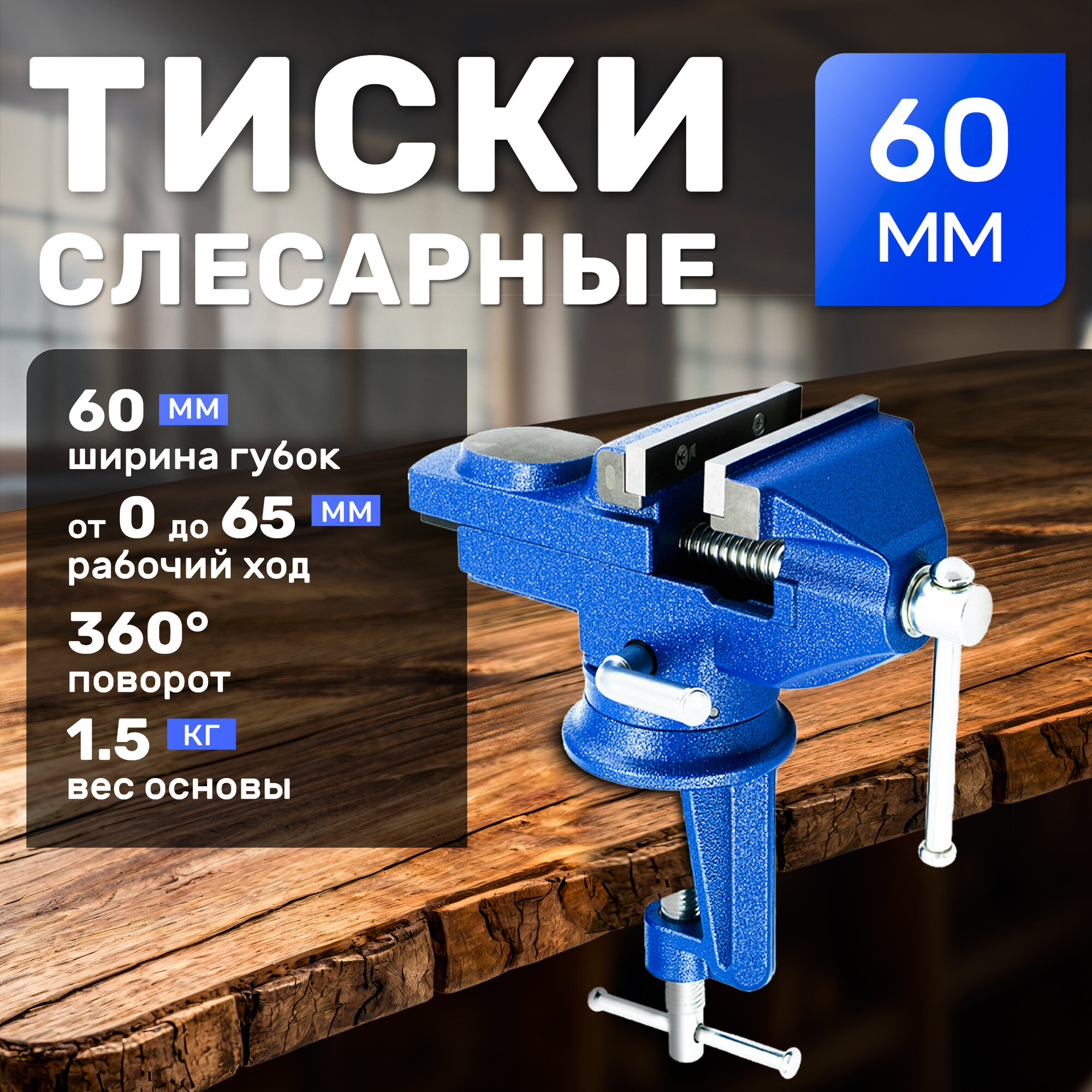Тиски слесарные 60 мм, настольные с наковальней и поворотным механизмом, ударопрочные, чугунные, синие