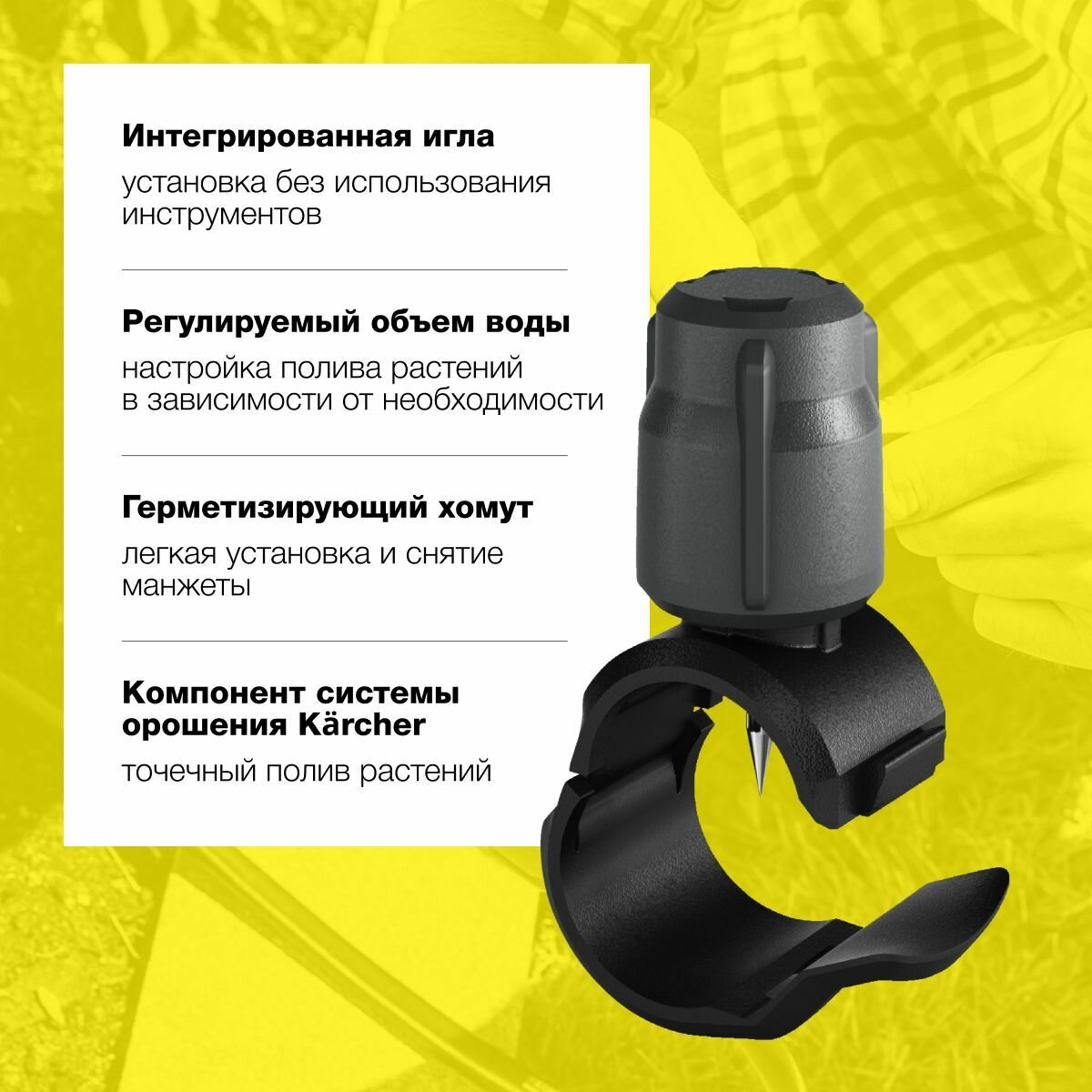 Капельница для капельного полива Karcher Rain System 2.645-234.0, закрепляется на системном шланге, регулировка расхода воды, в комплекте 5 шт информация: