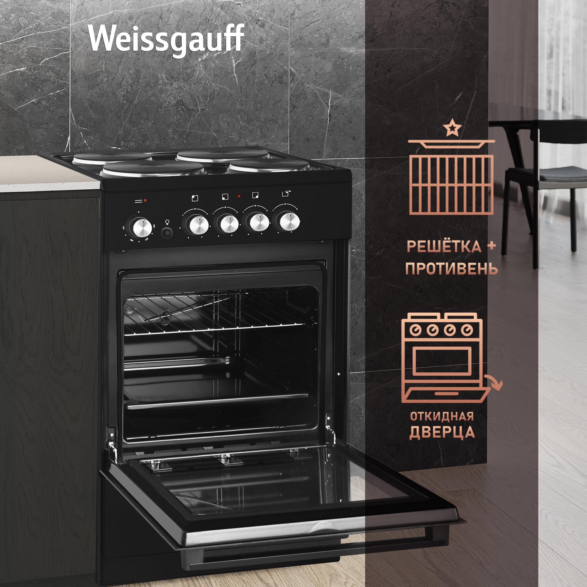 10 цен на Электрическая плита Weissgauff WES E2V00 BS 3 года гарантии, Объем 46 литров, Технологичные поворотные переключатели Soft Switch, Термостат духового шкафа