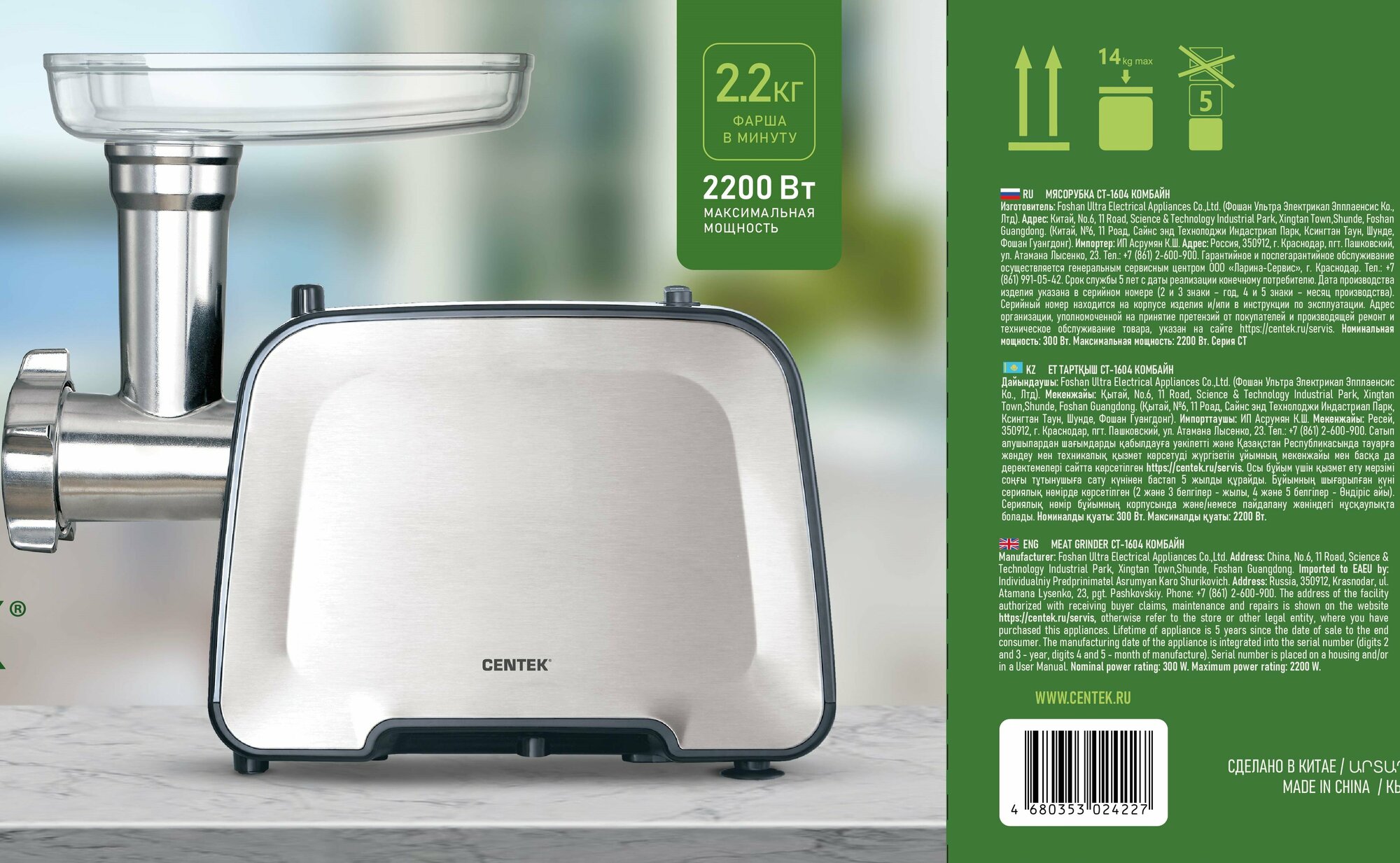 Мясорубка CENTEK CT-1604 2200 Bт, черный информация: