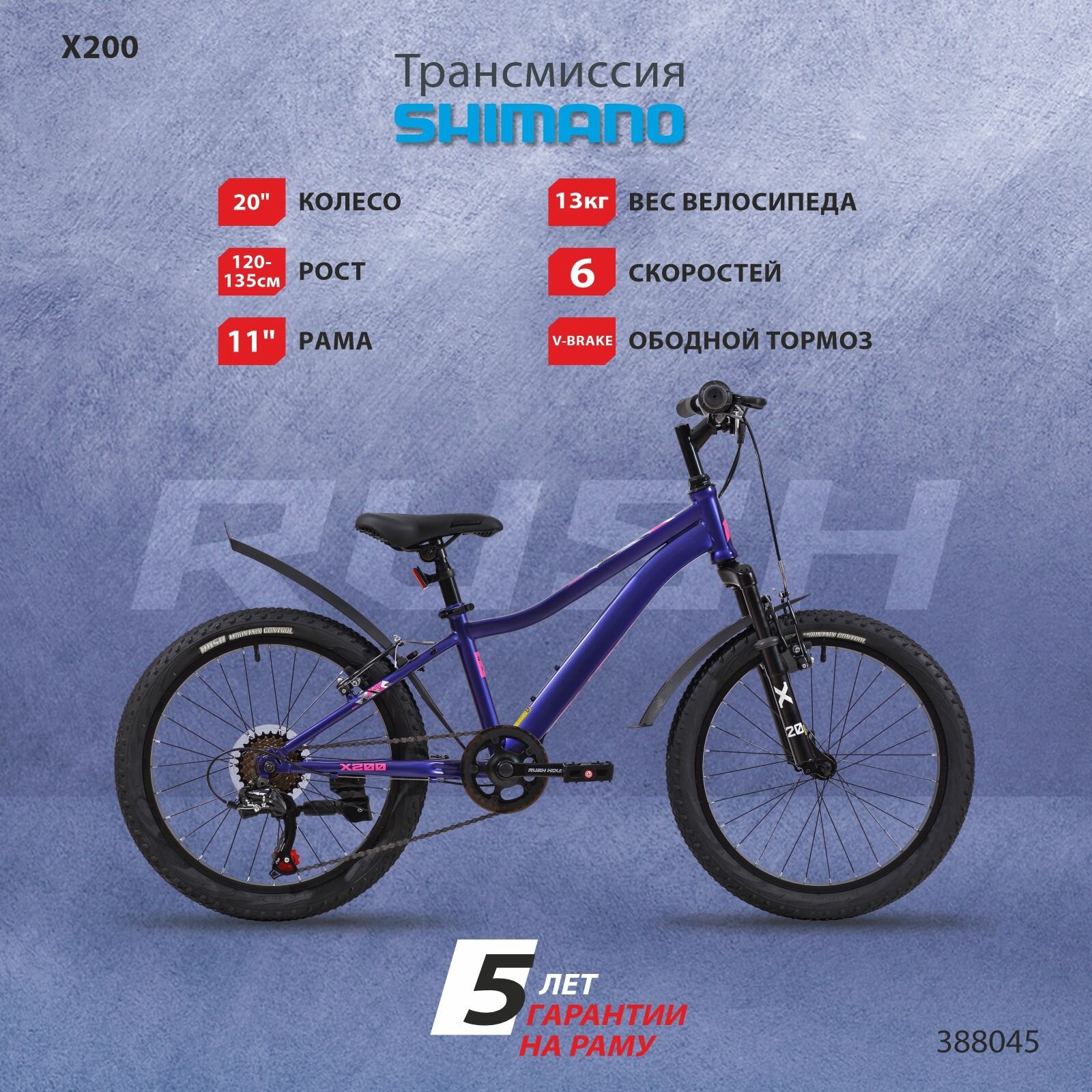 Велосипед детский горный 20" рост 120-135см 6 скоростей фиолетовый рама 11" велик 6 лет 7 лет 8 лет переключатель SHIMANO скоростной RUSH HOUR X 200 информация: