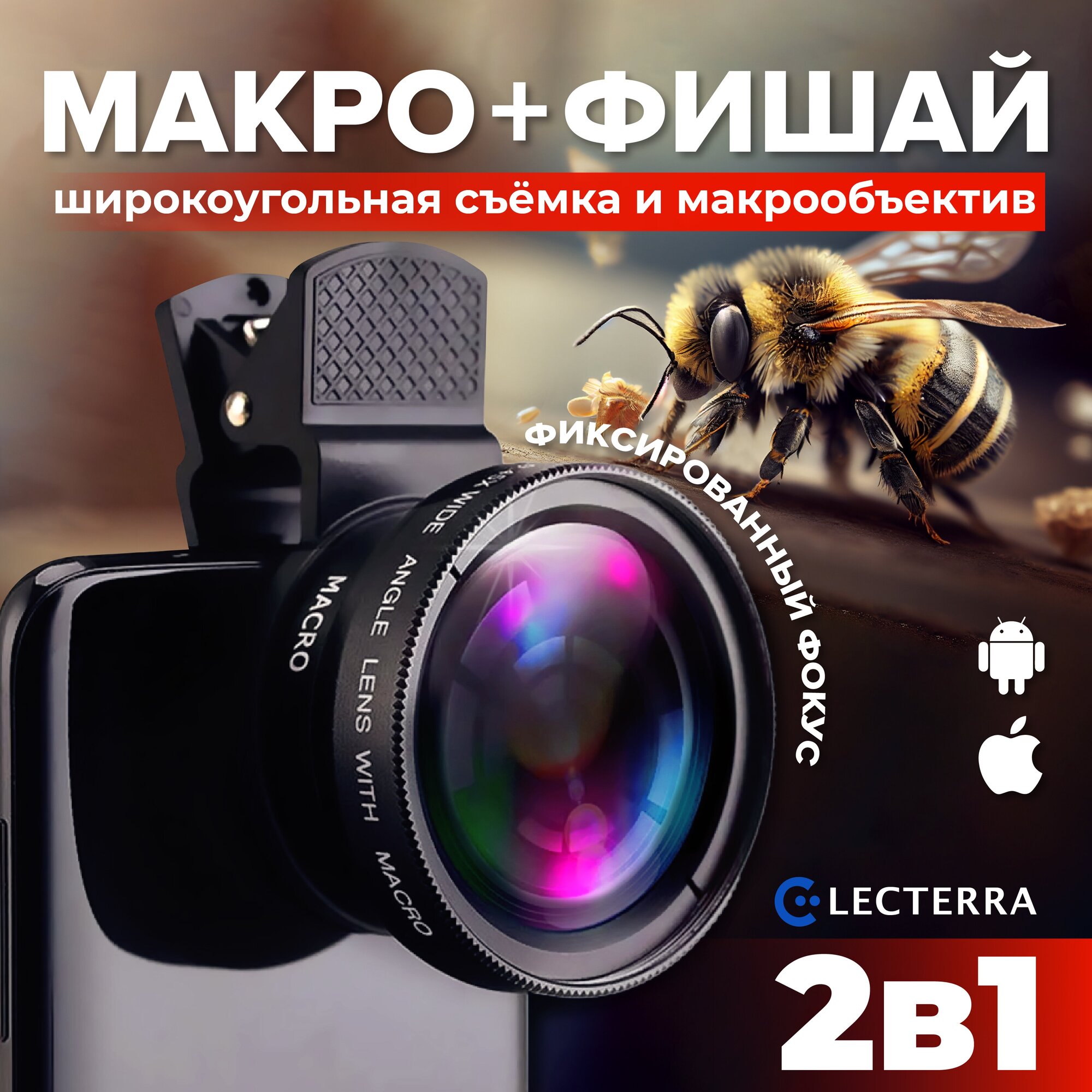 Объектив для телефона 2 в 1. Макросъемка и широкоформатная съемка. Electerra