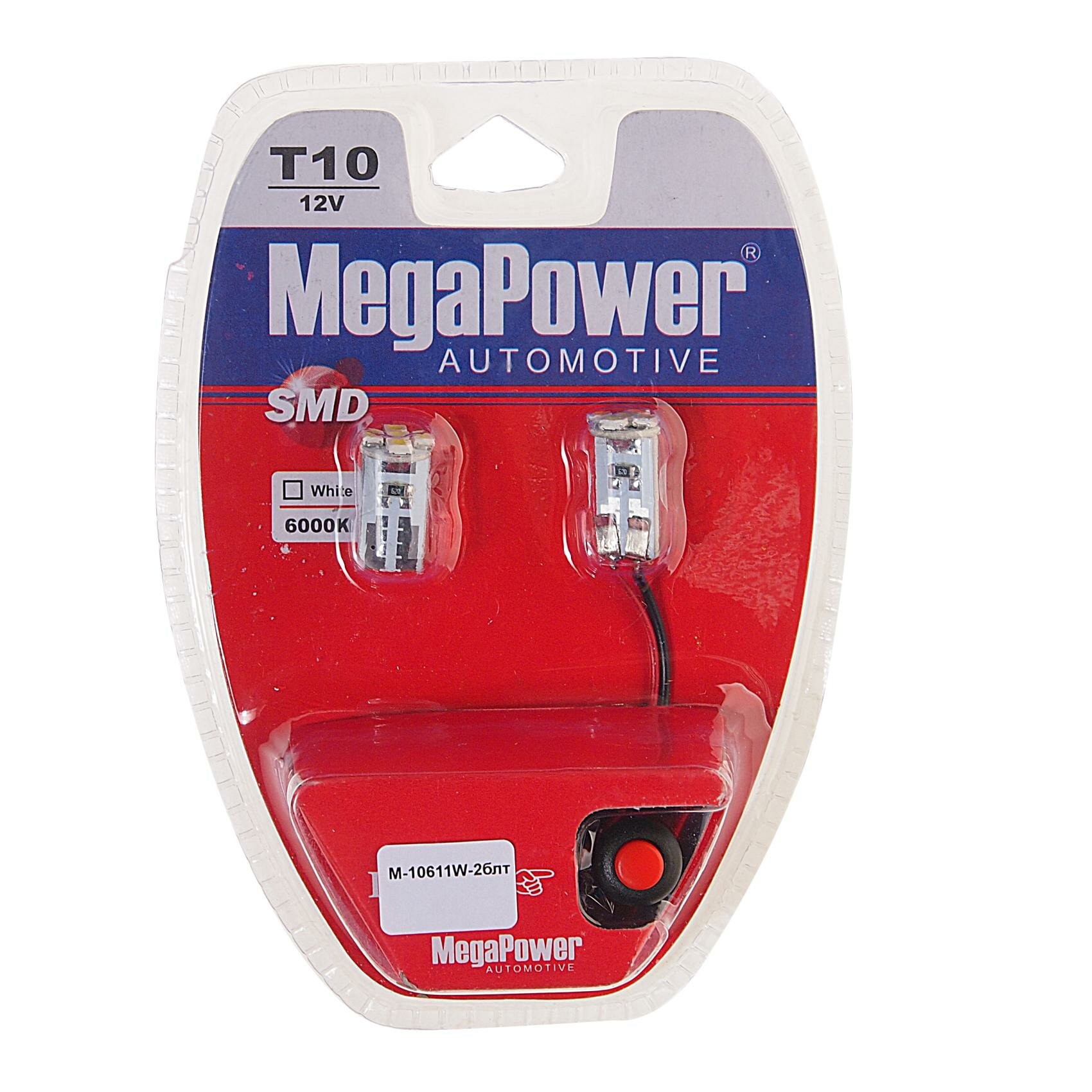 Отзывы на Автолампа T10W (W2,1x9,5d) 5 SMD 3528 WHITE блистер с тестером (2 шт) 6000K 90лм 12V MEGAPOWER