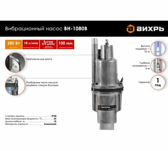 Насос / Вибрационный насос ВН-1080В Вихрь (280 Вт, высота подъема воды – 72 м, 18 л/мин, погружение до 3 м, 3/4", кабель – 10 м, верхний забор воды) информация: