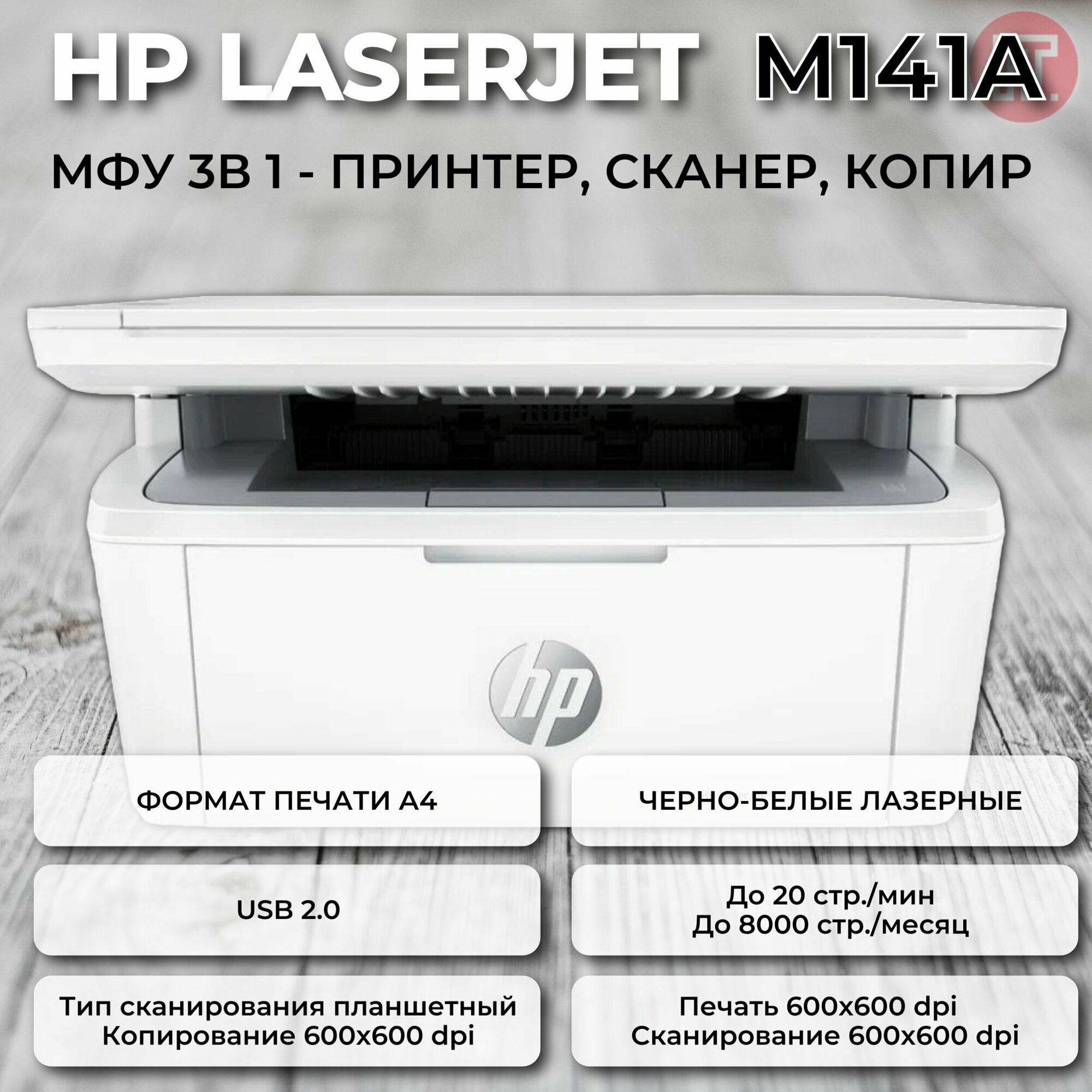 МФУ лазерное HP LaserJet MFP M141a (7MD73A), черно-белая печать, A4, 600x600 dpi, ч/б - 20 стр/мин (А4), USB