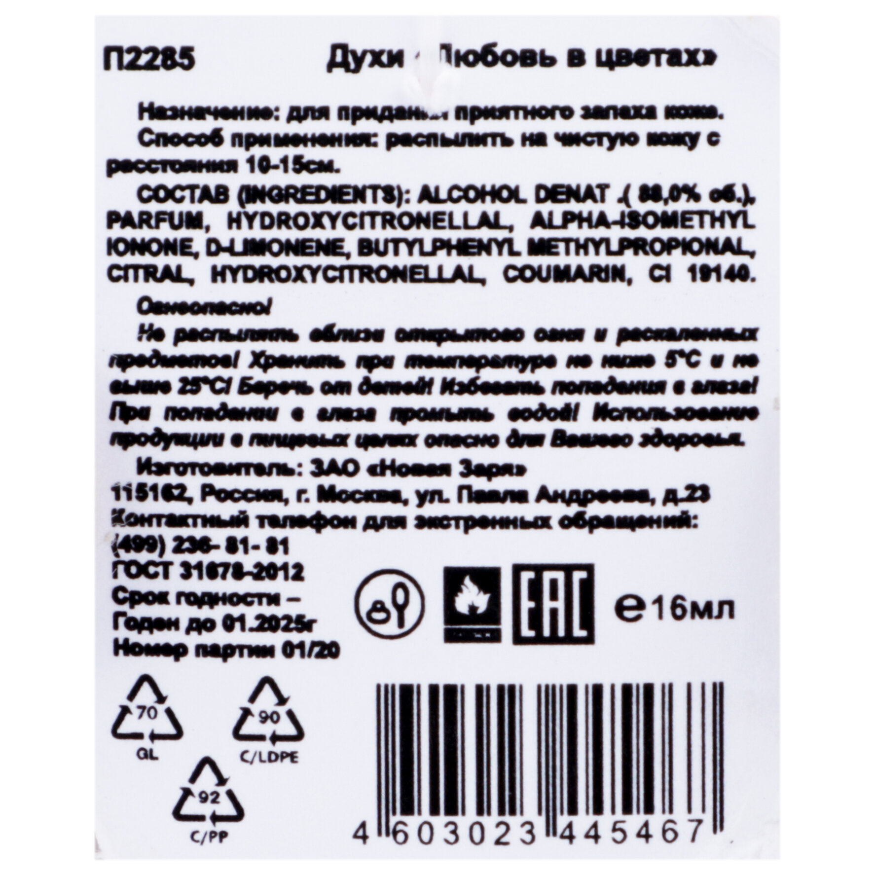 Новая Заря Женский Любовь в цветах (Amour en fleurs) Духи (parfum) 30мл