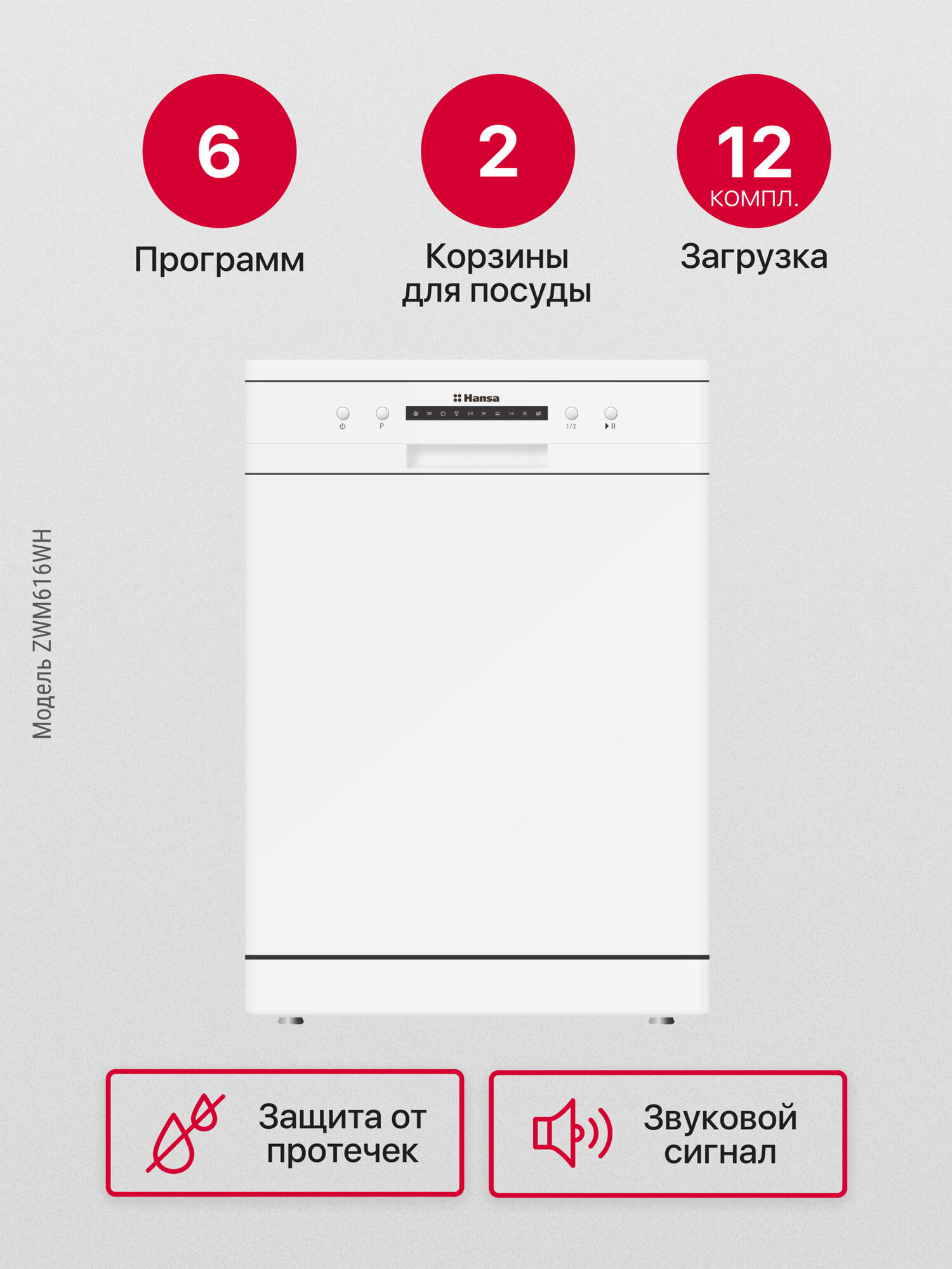Посудомоечная машина Hansa ZWM616WH, полноразмерная, напольная, 59.8см, загрузка 12 комплектов, белая 25 990 ₽