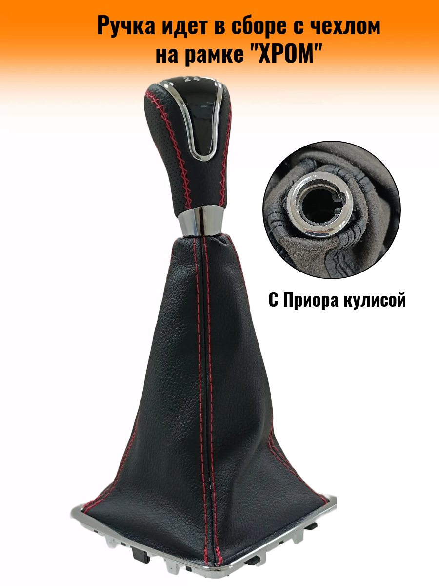 Ручка КПП с чехлом в стиле Весты на ВАЗ-2170 Лада Приора 1 (Lada Priora 1) с Приора кулисой, черный с красной строчкой "рамка хром" информация: