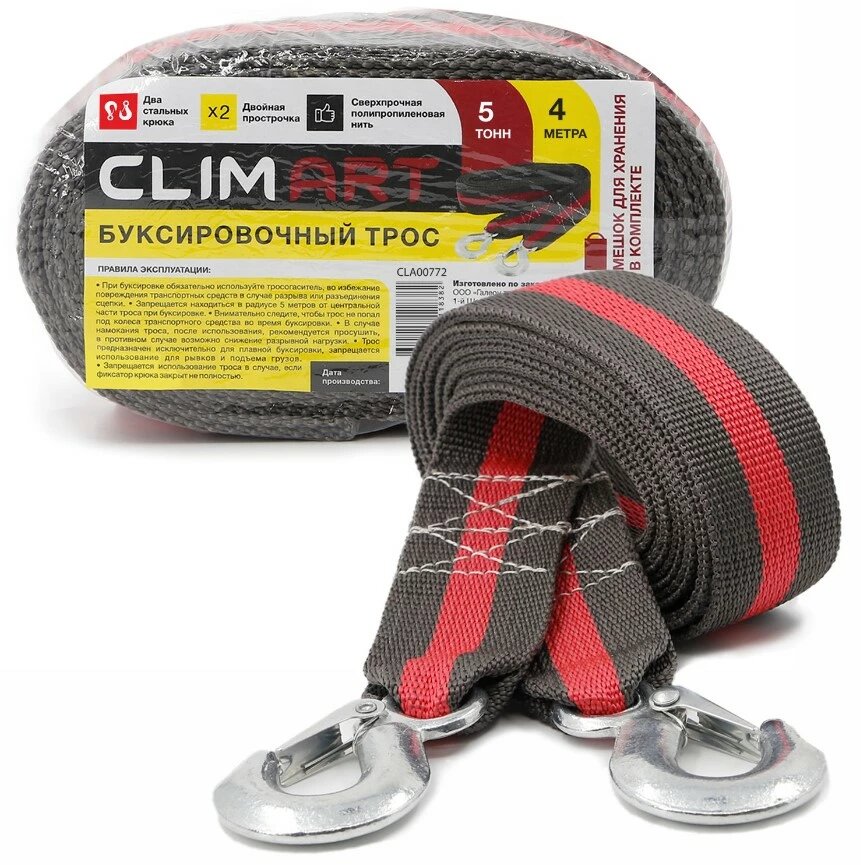 10 цен на Трос буксир. (5 т) лента 2 крюка /4 м/ с мешком, термоупаковка CLIM ART CLA00772