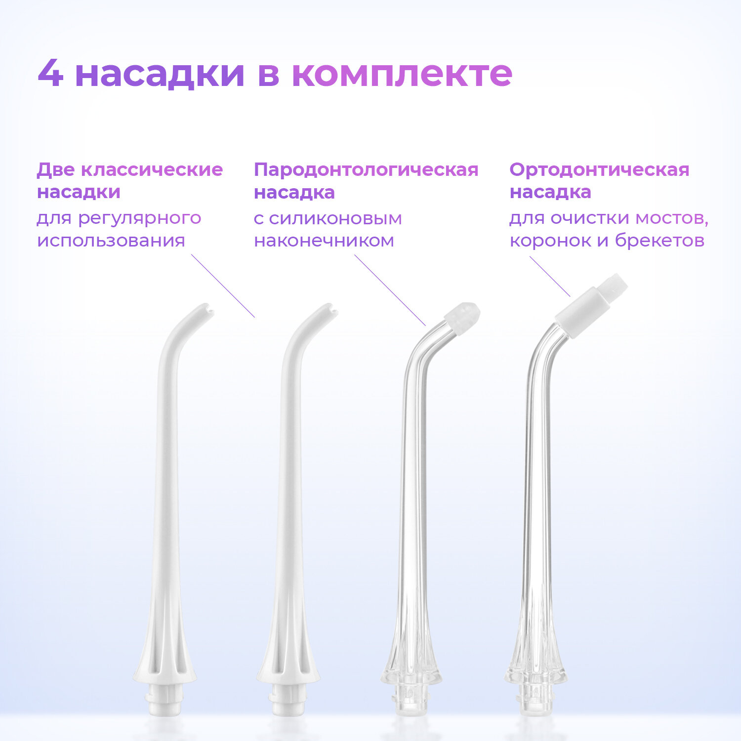 | Насадки | для струйной чистки / для чистки имплантов и коронок / ортодонтическая (для брекетов) / пародонтологическая (для десен) |