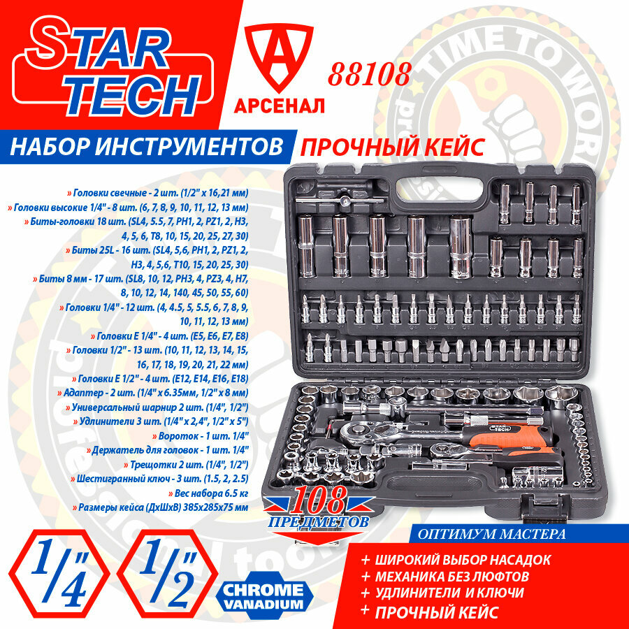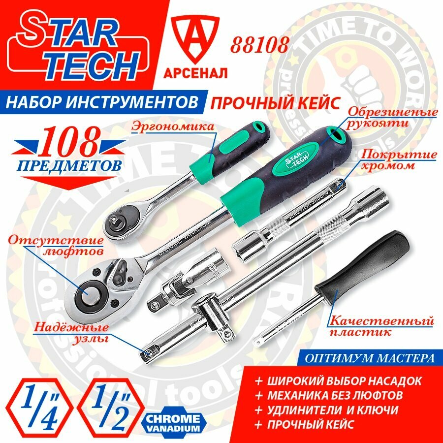 Набор инструментов 108 предметов StarTech 1/2" и 1/4" (головки торцевые, биты), ST88108 информация: