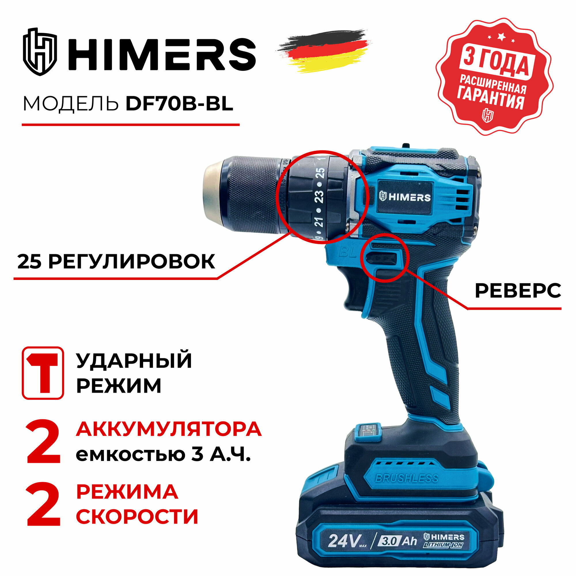 Отзывы на Бесщеточный шуруповерт HIMERS DF70B-BL аккумуляторный 24V, 2 АКБ по 3 А.ч, 70 Н.м, 13мм патрон, Кейс с набором бит, свёрел, головок инструментов 24 предмета, ударный
