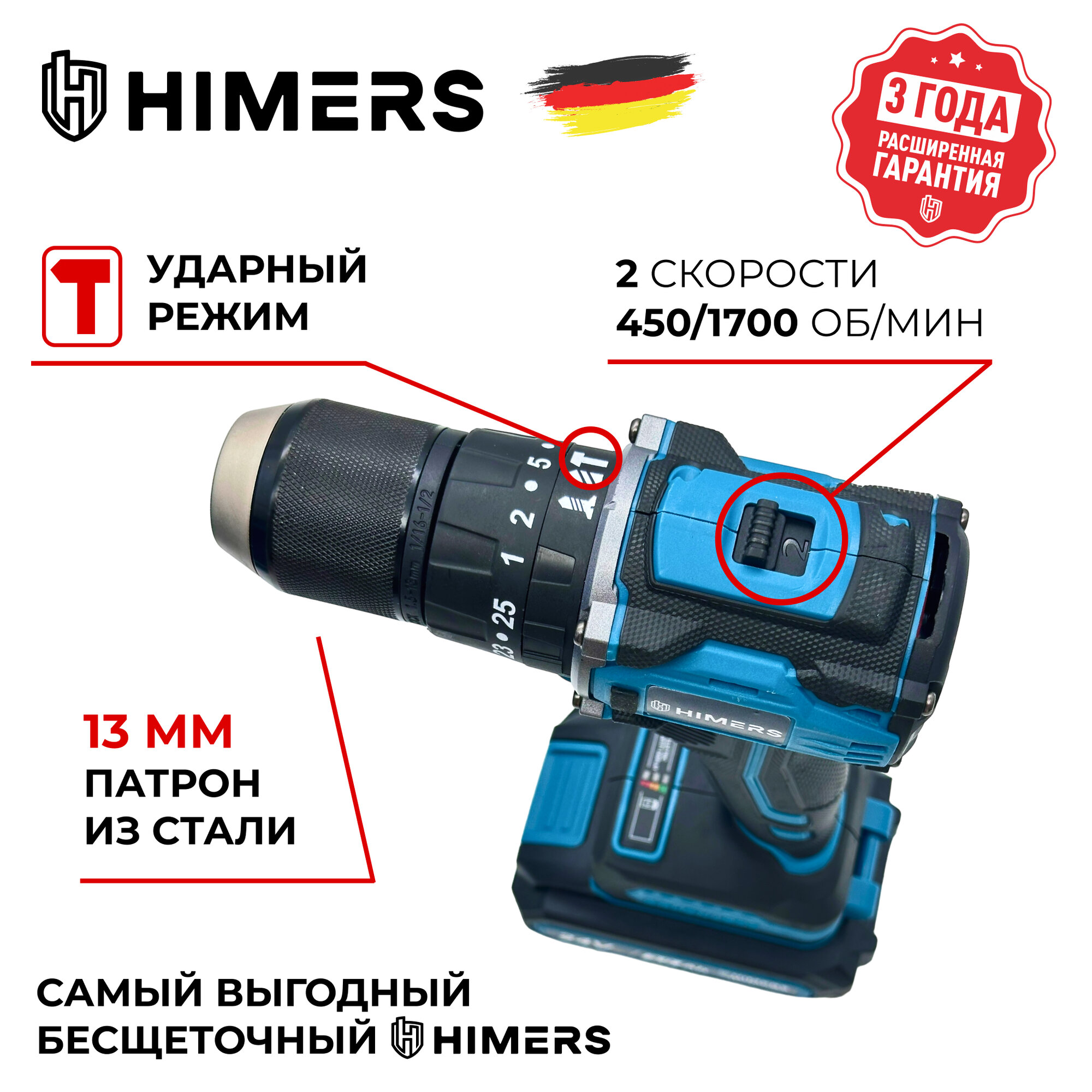 Бесщеточный шуруповерт HIMERS DF75Y-BL аккумуляторный 24V, 2 АКБ по 3 А. ч, 75 Н. м, 13мм патрон, кейс 6 930 ₽
