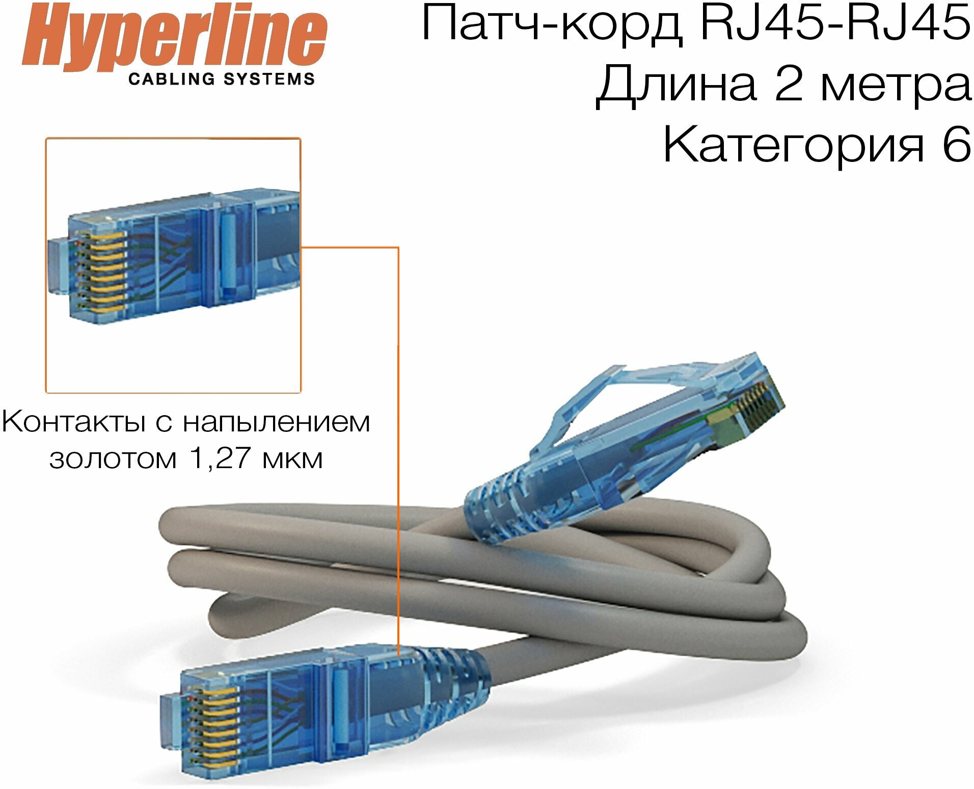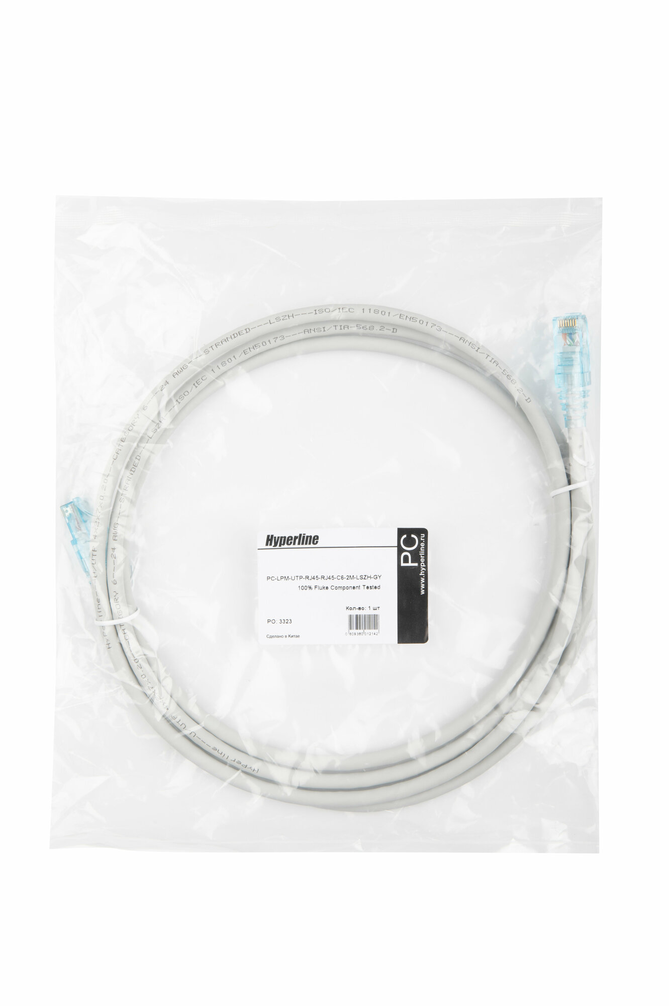 Патч-корд Hyperline сетевой кабель витой Ethernet Lan для интернета категория 6 U/UTP, 100% Fluke, LSZH, 2 м, серый информация: