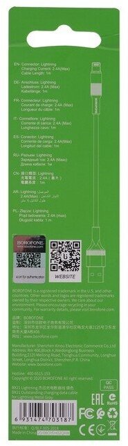 USB Кабель для Apple/iPhone BOROFONE BX21, 2A, 1м. Серый информация: