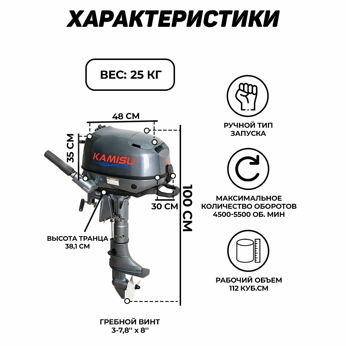 Подвесной лодочный мотор KAMISU F5BMS, бензиновый, четырехтактный, 5 л.с., 3.7 кВт информация: