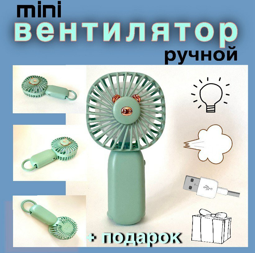 Отзывы на Вентилятор ручной мини маленький портативный юсб usb, на аккумуляторе с фонариком, мощный, зеленый-золотой, мишка
