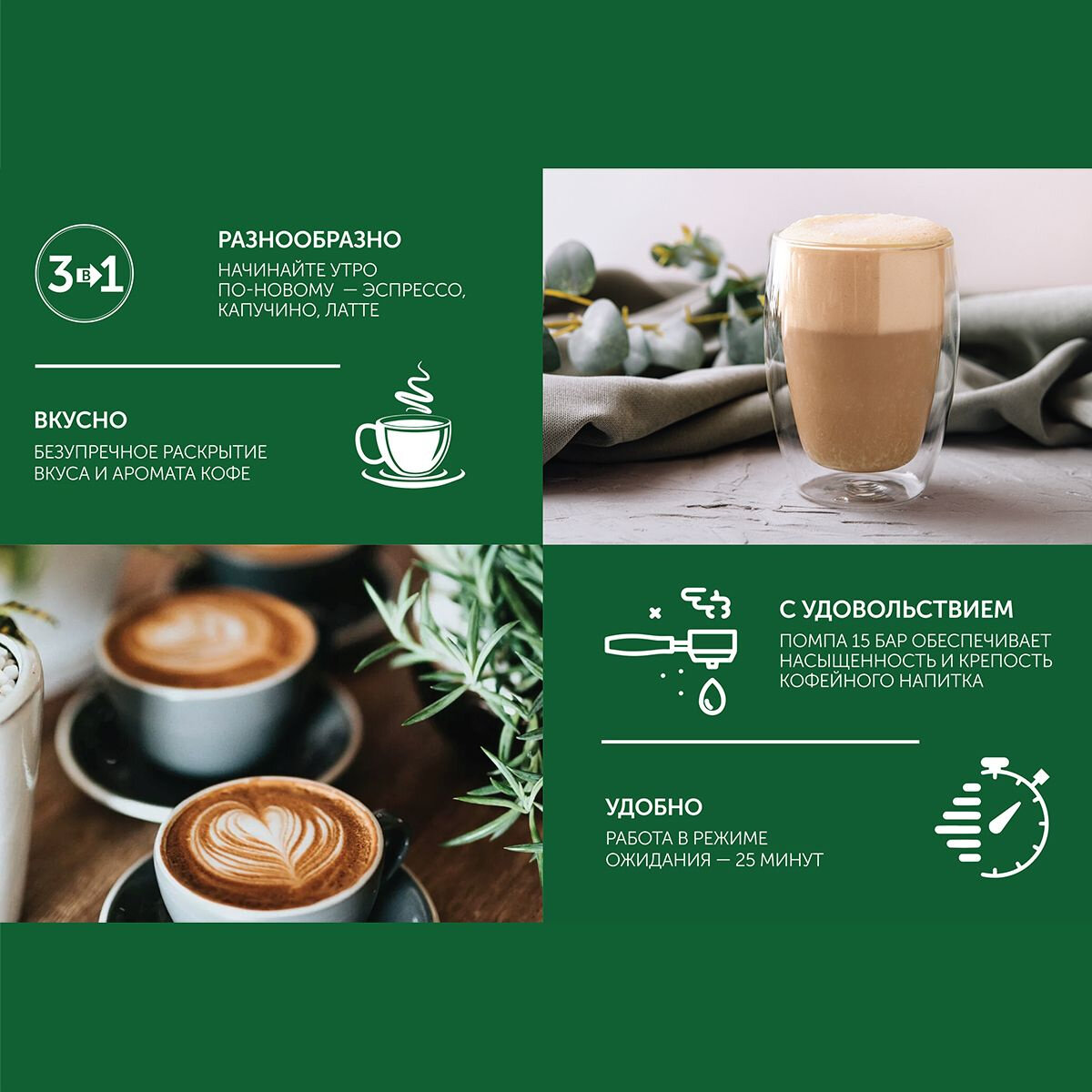 | Тип напитка | капучино / латте / эспрессо |